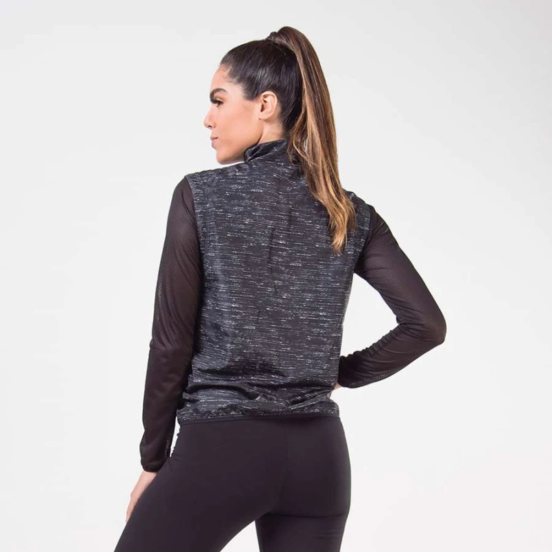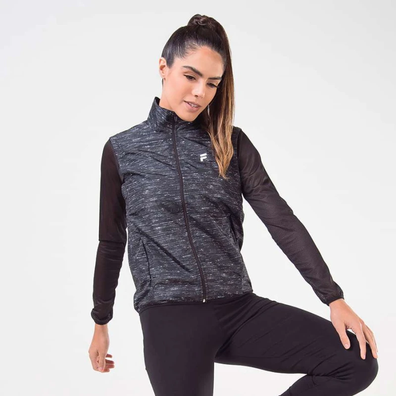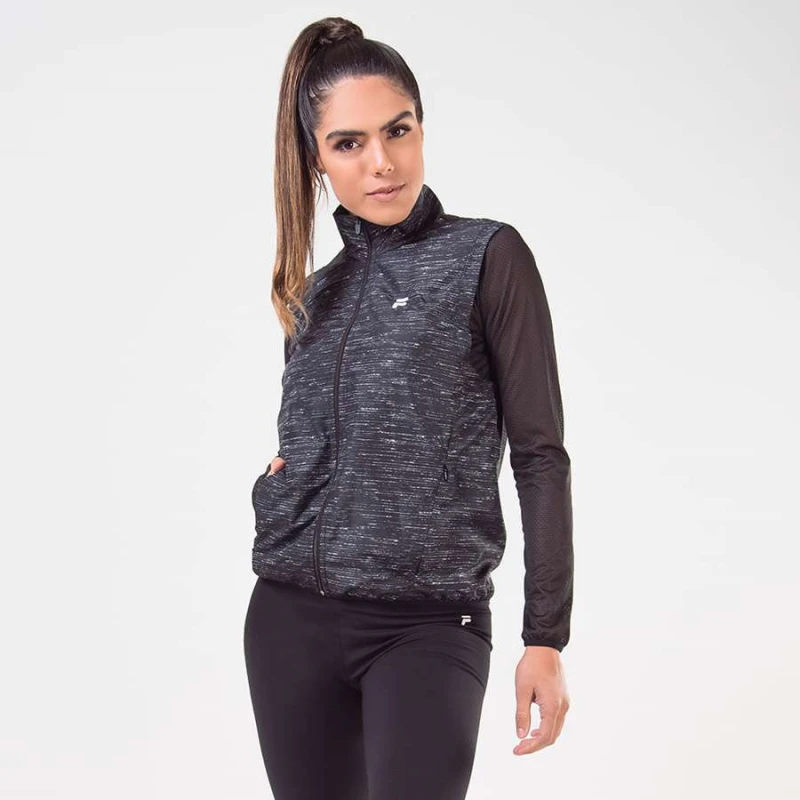 Corpo em tecido plano, mangas em malha com elastano com modelagem ajustada. Possui fechamento com zíper frontal, bolsos com zíper invisível e acabamento em elástico nos punhos e barra.