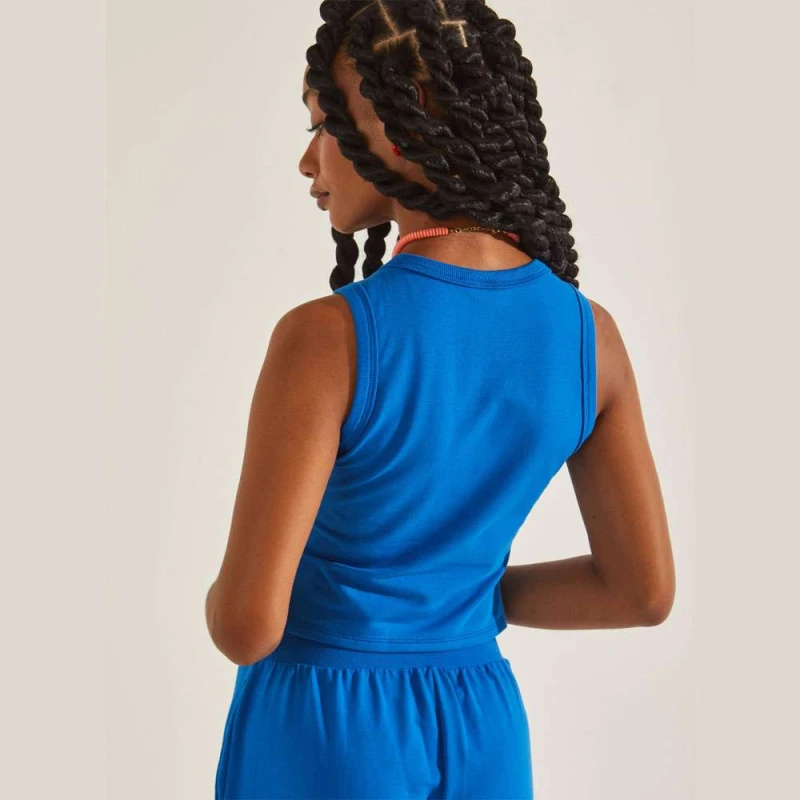 A peça possui gola arredondada, laterais cavadas, aplicação de etiqueta emborrachada, barra inferior com sobreposição e comprimento cropped.