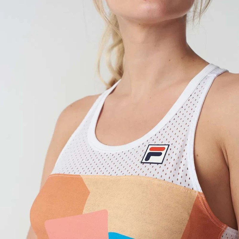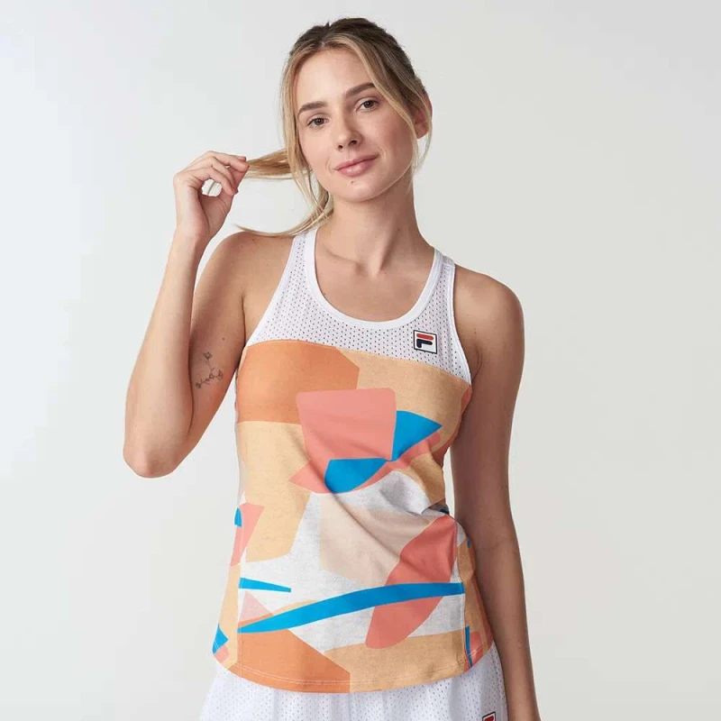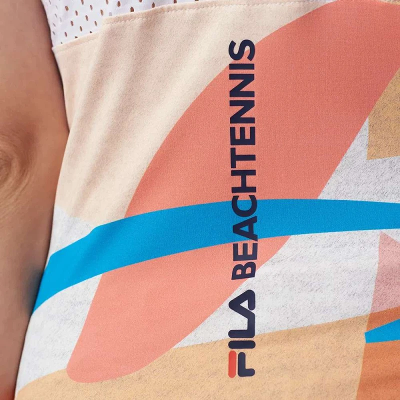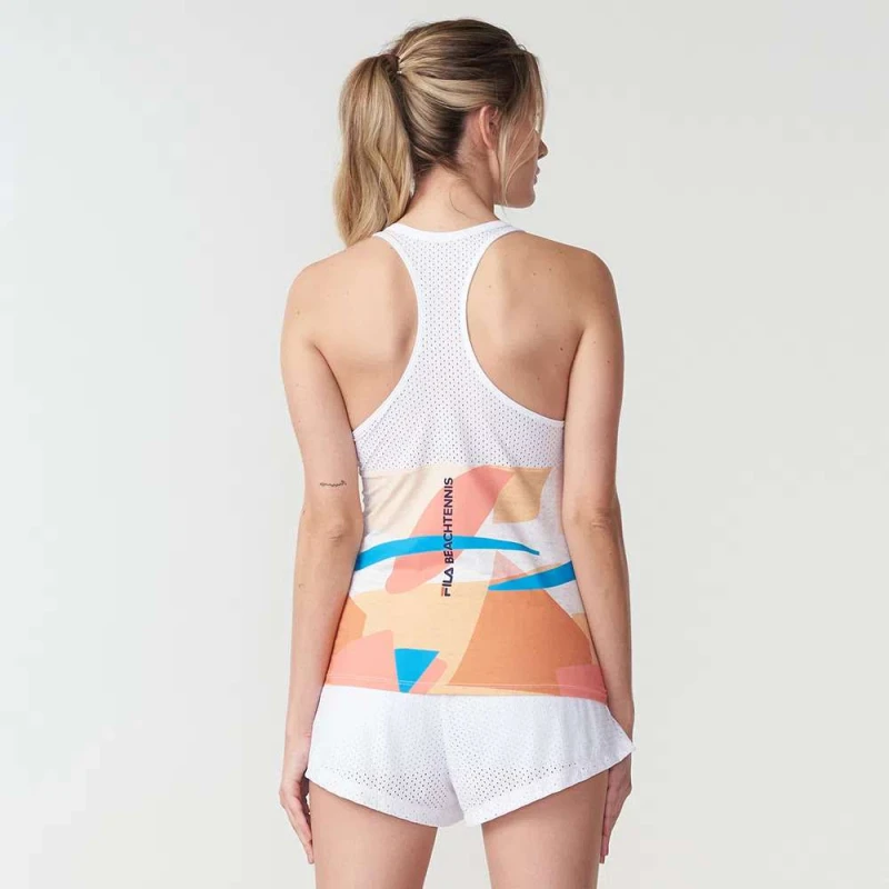 A Regata Feminina Fila Sand BT da Coleção Beach Tennis conta com tecido de proteção UV e tecnologia que reduz em 1,5ºC a temperatura corporal.