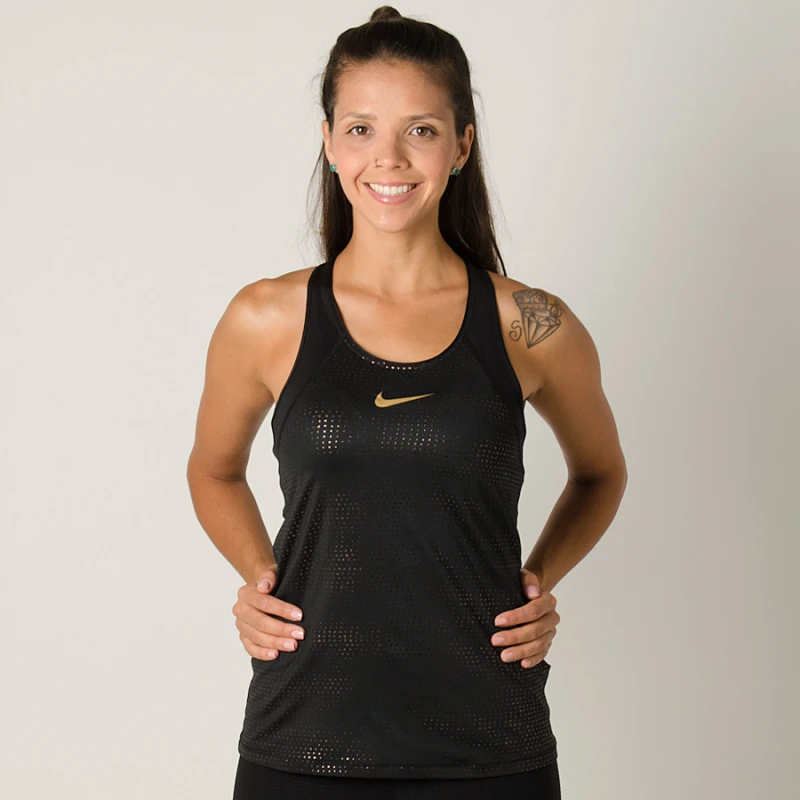 Medidas da modelo Tayse que veste a Regata Nike Pro Tank Metallic Feminina na cor: Preto/Dourado no tamanho: M