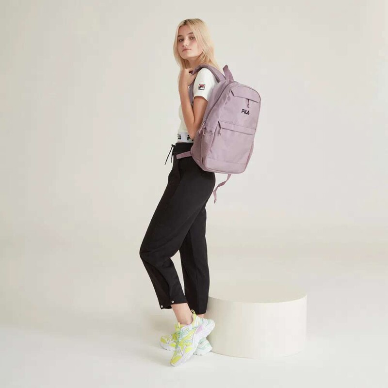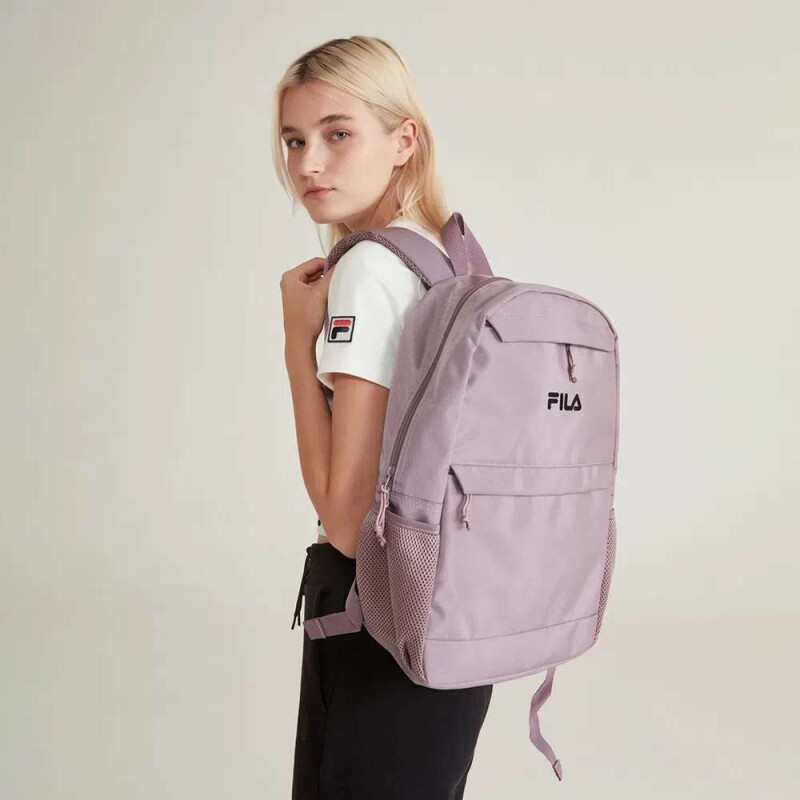 Logo fila em cor contrastante estampado com relevo no painel frontal e logo F na alça.
