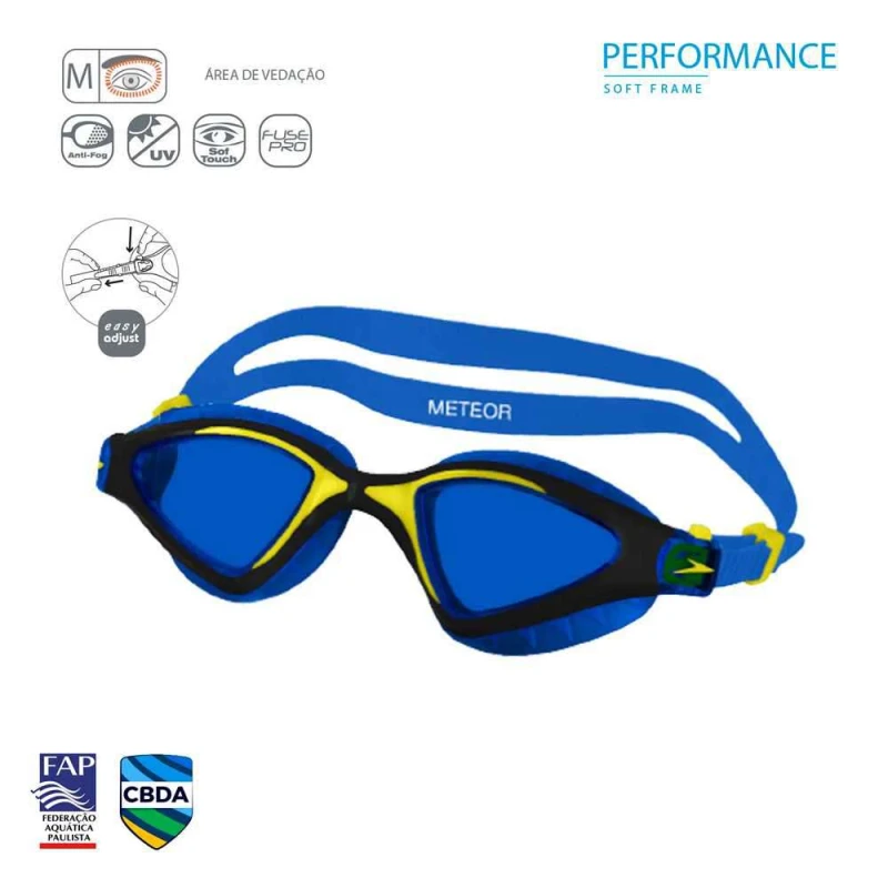 O Óculos Speedo Meteor traz lentes compostas em 100% Policarbonato com tratamento antiembaçante e proteção contra raios ultravioletas, além de minimizar a distorção dentro da água.