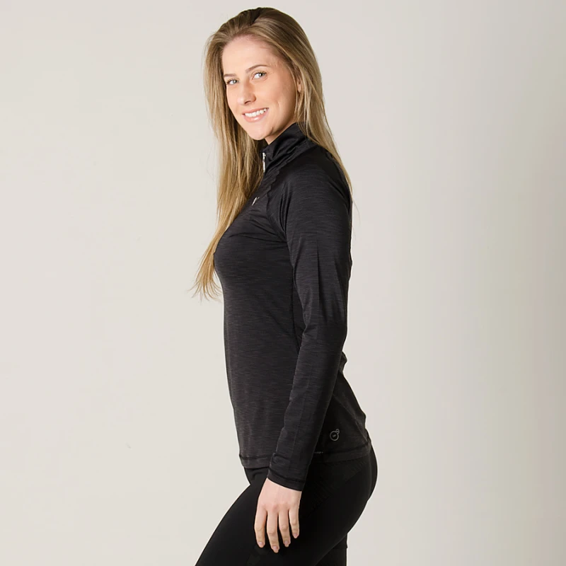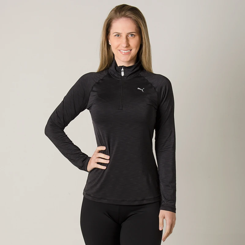 Feita em gola alta e meio zíper, ajuda a manter o corpo seco e confortável.