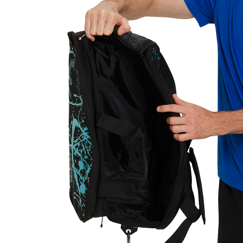 Composta por dois compartimentos, sendo um ideal para guardar suas raquetes e outro maior para suas roupas ou outras utilidades, além de um bolso pequeno atrás para organizar pequenos objetos pessoais como chaves, todos esses bolsos possuem fechamento em zíper.