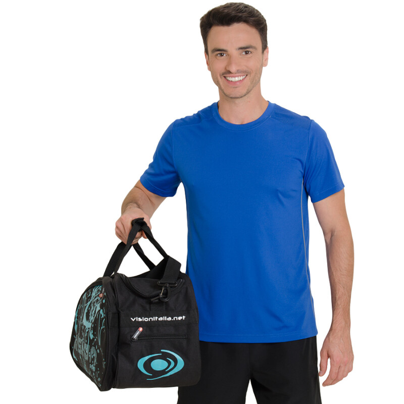 Sua alça de ombro é acolchoada e ajustável e está escrito Vision Pro nas laterais e em baixo da raqueteira.