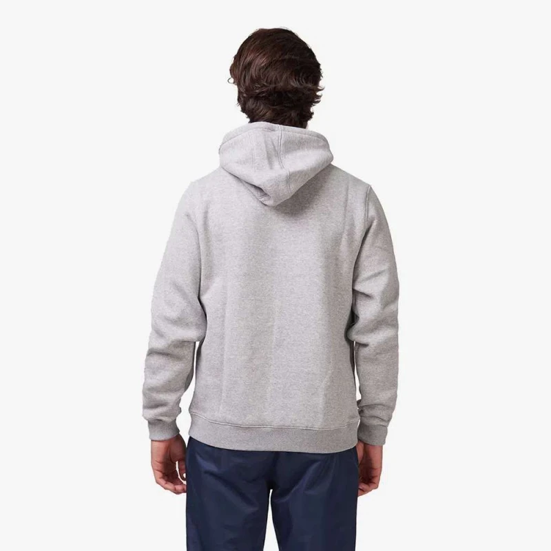 Modelo com capuz transpassado, bolso canguru e acabamentos de pesponto nas cavas, punhos, barra e gola.