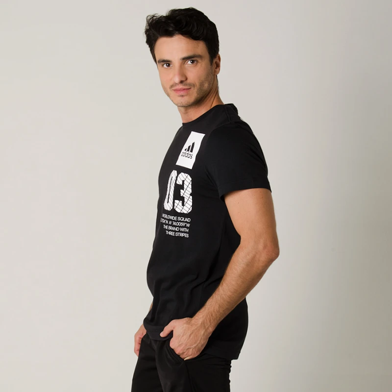Medidas do modelo Julian que veste a Camiseta adidas City New York Masculina na cor: Preto/Branco no tamanho: M