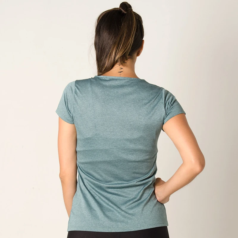Medidas da modelo Jaqueline que veste a Camiseta adidas ESS MF EGB TEE Feminina nas cores: Verde e Azul/Preto no tamanho: P