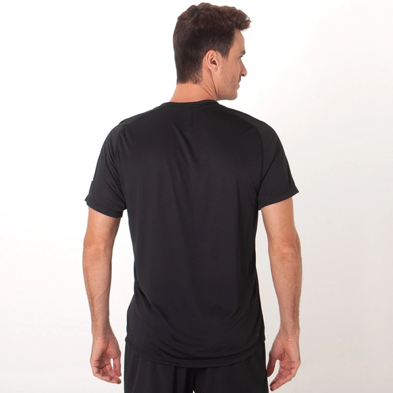 O caimento atlético é largo no peito e justo no corpo e nas mangas.