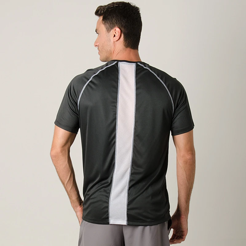 Com gola careca, a camiseta oferece detalhes refletivos que aumentam a visibilidade em locais de pouca luz, facilitando os treinos noturnos.