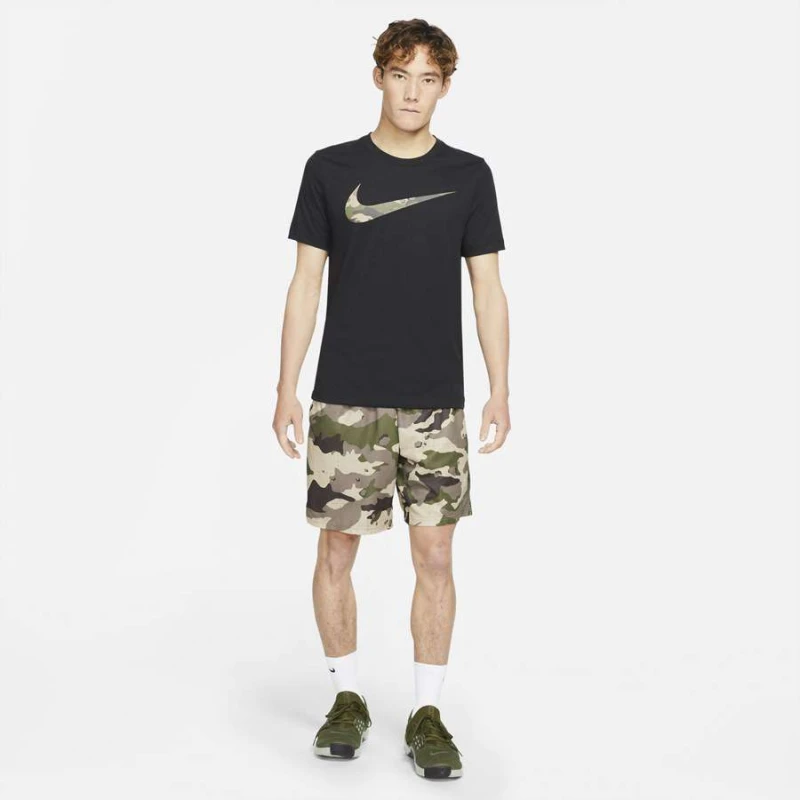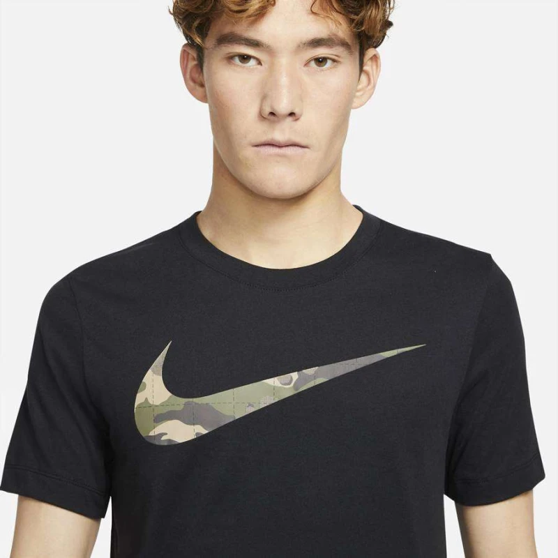 Um logotipo Swoosh com preenchimento camuflado se sobresai.
