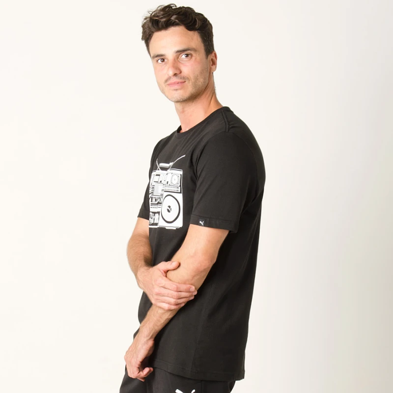 A Camiseta Puma BB Tee Masculina possui estampa frontal com o desenho de um rádio e o nome da marca fornecedora em destaque.