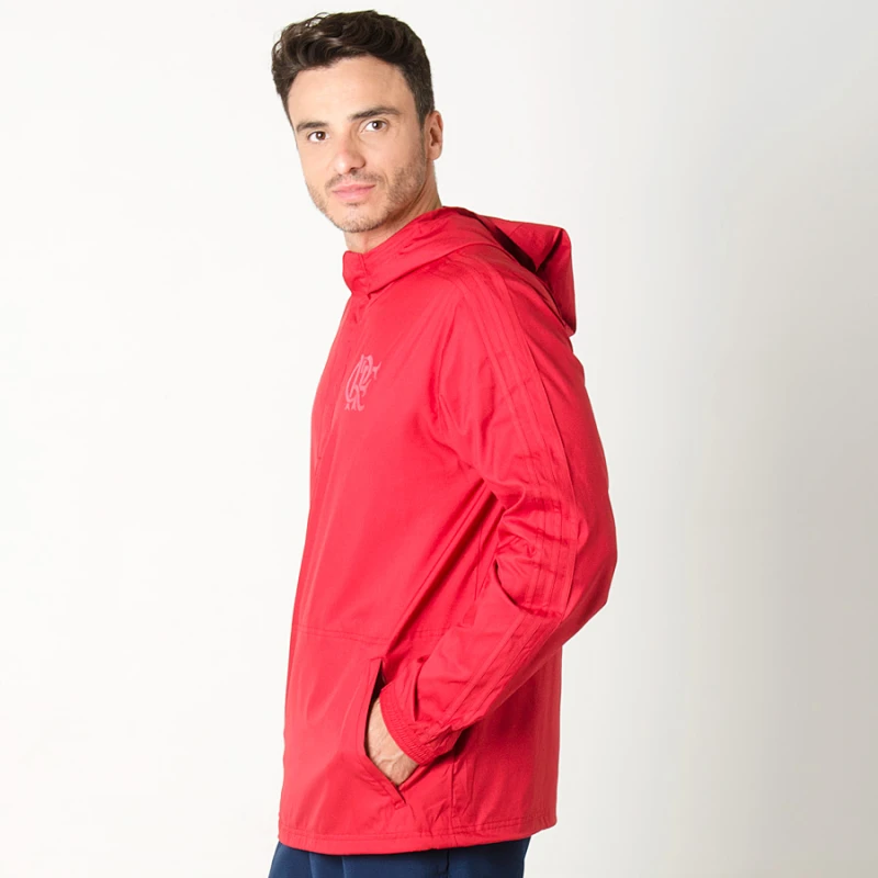 A Jaqueta adidas Wind CR Flamengo Seasonal Special Masculina tem capuz de três painéis, barra ajustável por cordão, meio fecho de zíper e proteção contra a chuva para conforto sempre.