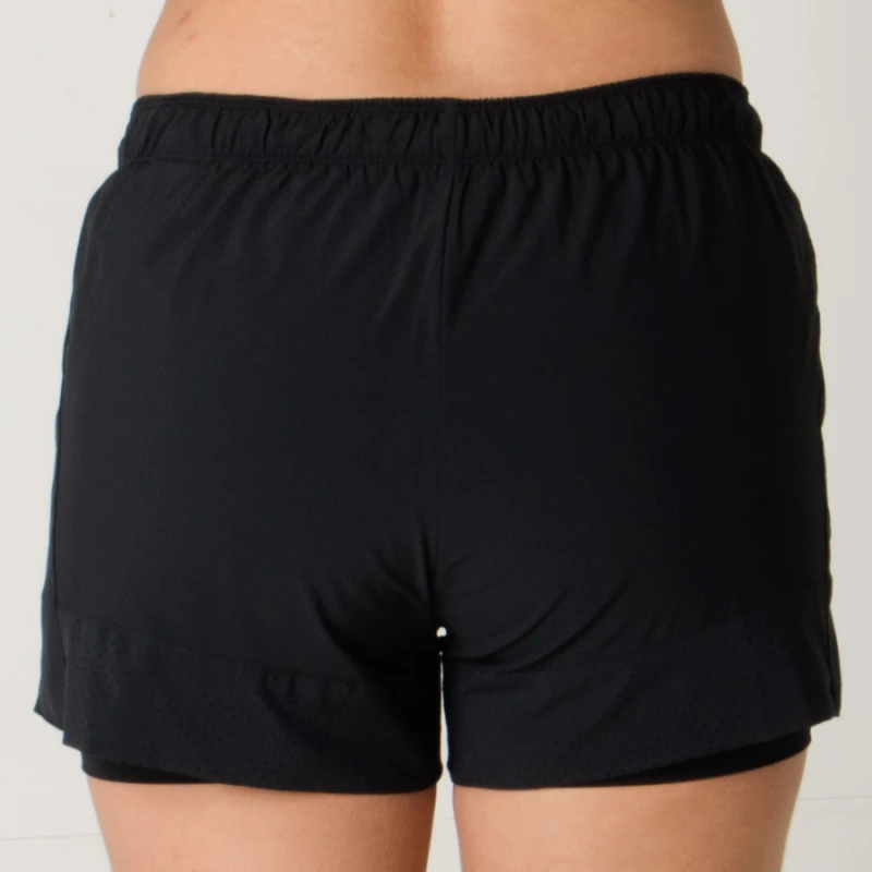 Tem um shorts de compressão embutido oferecendo suporte e conforto, além de cós com elástico e cordão interno para um ajuste confortável e firme.
