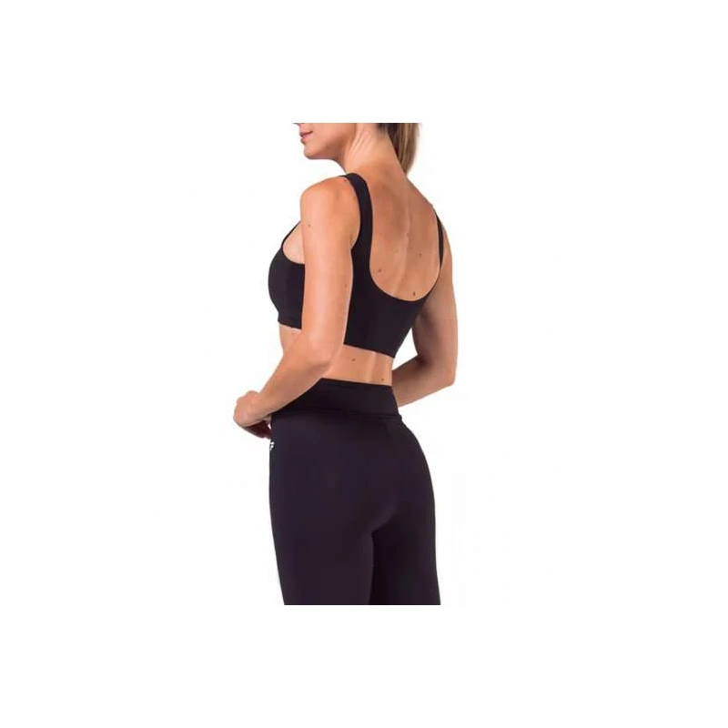 A modelagem equilibrada com decote em 'U' e alças largas garante um caimento seguro e cômodo, oferecendo a sustentação necessária para os exercícios.