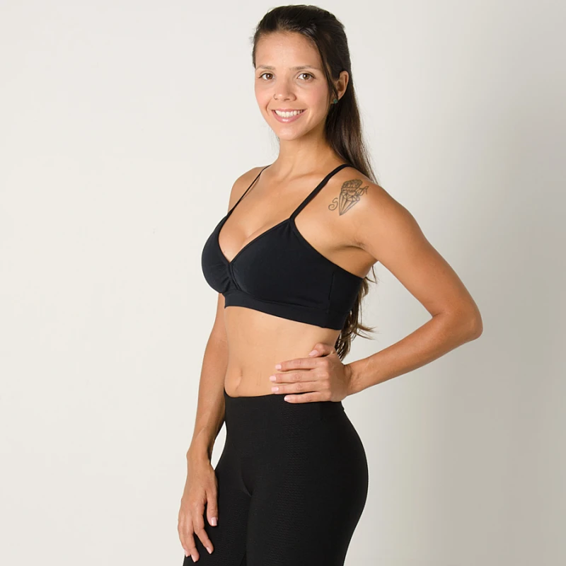Medidas da modelo Tayse que veste o Top Mizuno Essence Com Bojo Feminino nas cores: Preto e Branco no tamanho: M