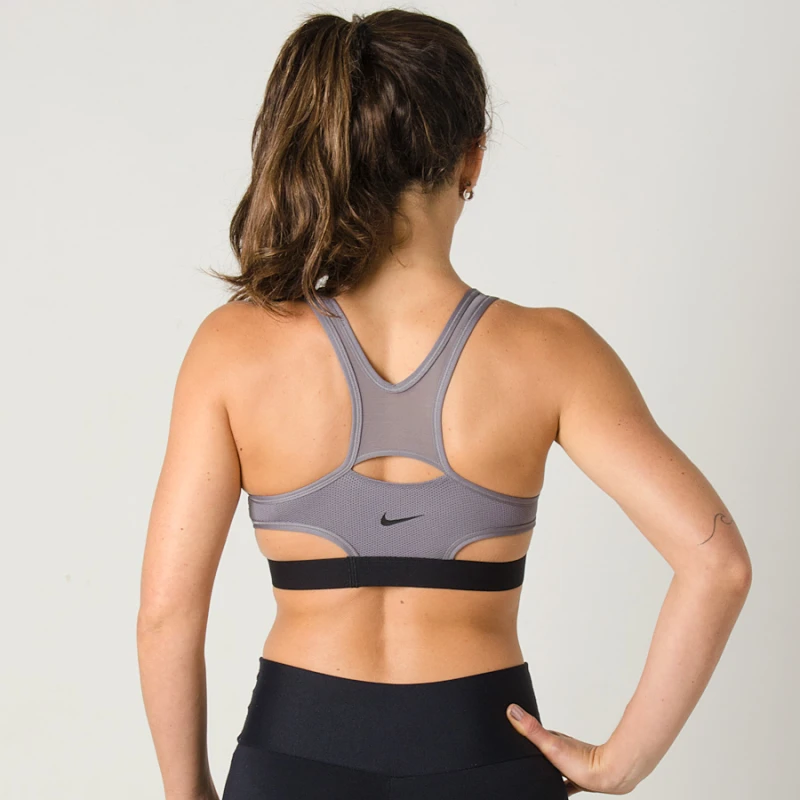 O Top Nike Swoosh Logo Feminino suporte médio é feito com tecido que absorve o suor em um modelo costas nadador para ajudar a manter você seca, confortável e livre para se mover durante o treino.
