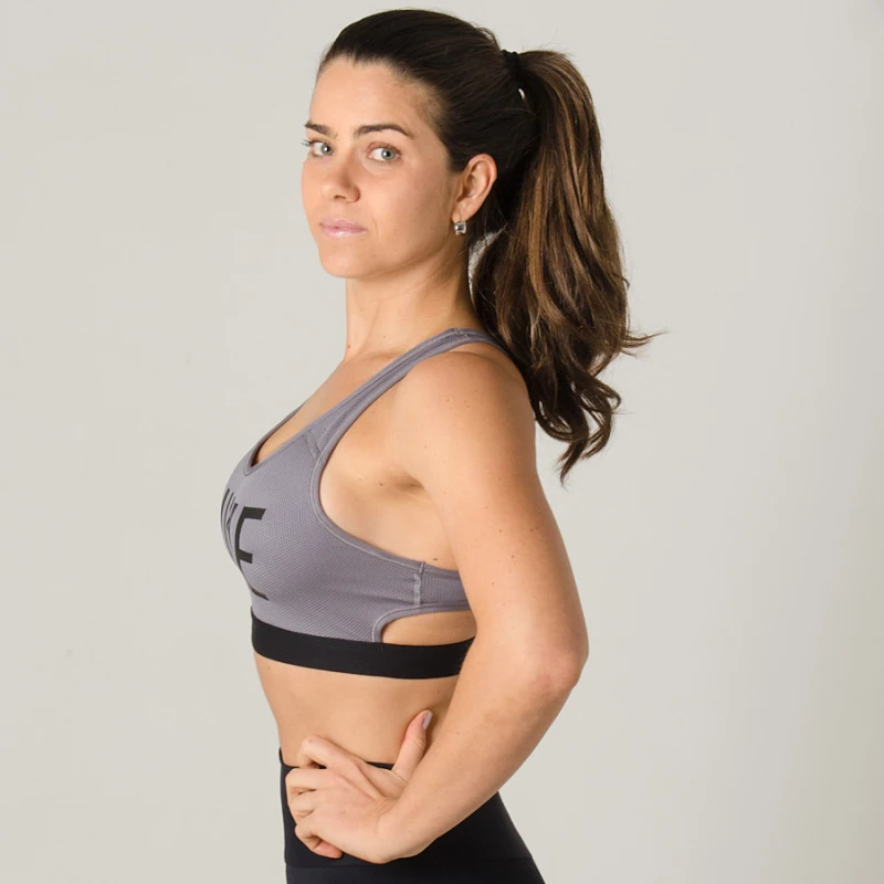 Medidas da modelo Camila que veste o Top Nike Swoosh Logo Feminino na cor: Grafite/Preto no tamanho: P