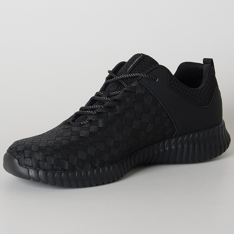 Possui cabedal confeccionado em material têxtil trançado e sobreposição em sintético para suporte e apoio.