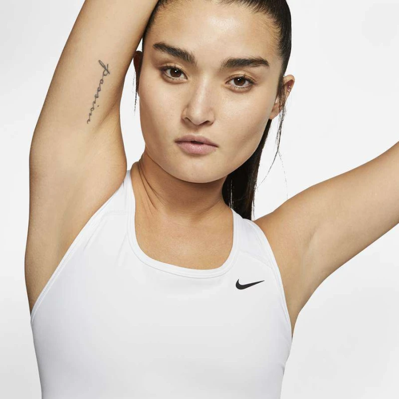 O Top Nike Swoosh Feminino não acolchoado combina tecido de compressão com tecnologia antissuor para ajudar você a se sentir segura e se manter seca durante treinos de médio impacto.