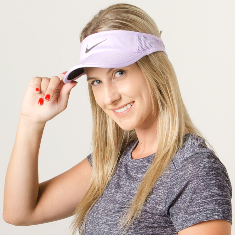 Medidas da modelo Jacqueline que usa a Viseira Nike Aerobill Featherlight Feminina nas cores: Preto/Branco, Branco/Preto e Lilás/Preto