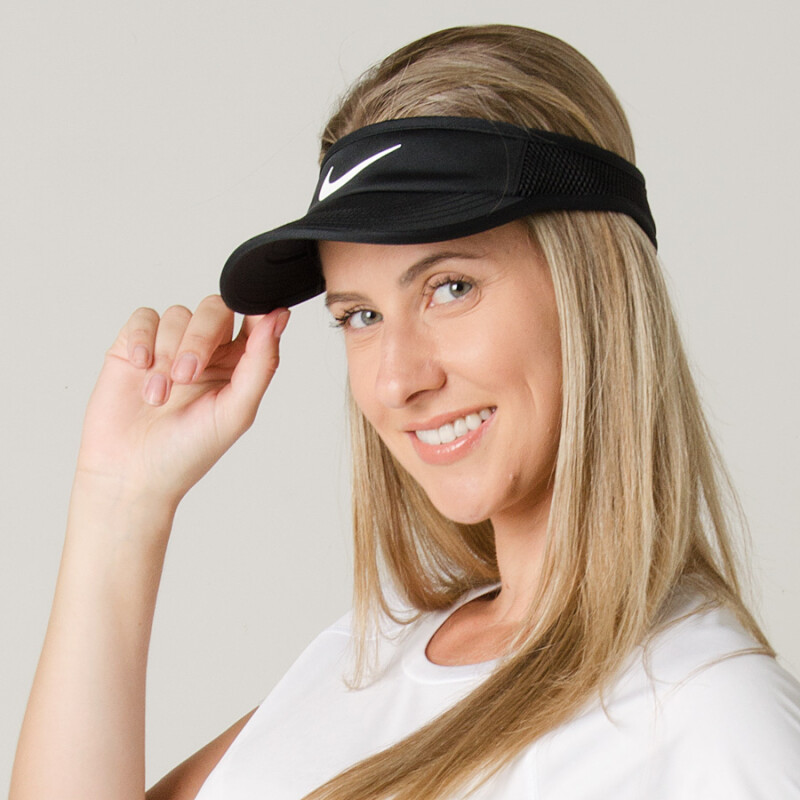 Medidas da modelo Jacqueline que usa a Viseira Nike Aerobill Featherlight Feminina nas cores: Preto/Branco, Branco/Preto e Lilás/Preto